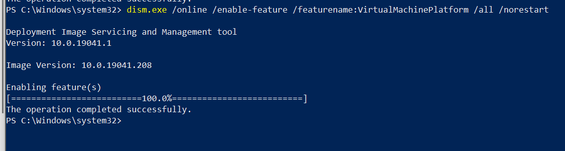 dism.exe /online /enable-feature /featurename:VirtualMachinePlatform /all /norestart