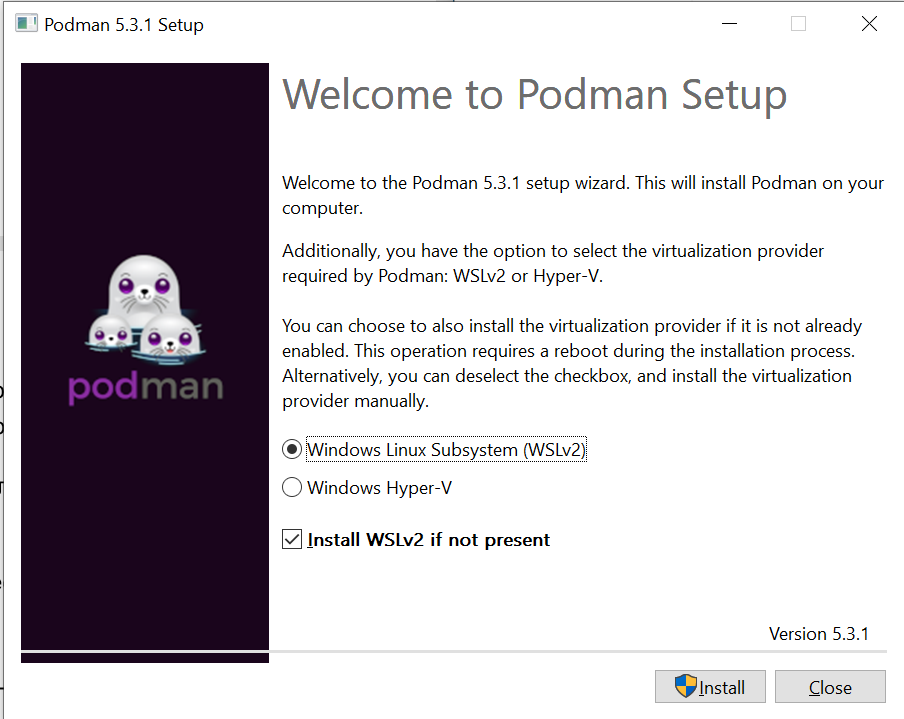 Скачать и установить podman. Установщик предложит установить WSL, нужно согласиться. Компьютер может быть перезагружен несколько раз.