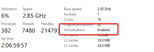 - Убедиться, что на компьютере включена виртуализация, сделать это можно через менеджер рабочих процессов (CTRL+ALT+DEL), закладка производительность: