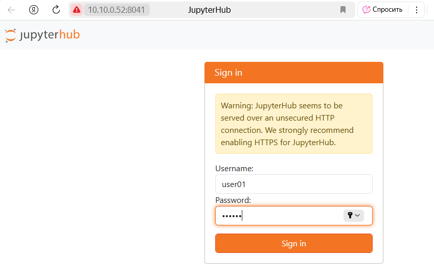 - После установки или обновления ПО, заходим в JupiterHub при помощи любого интернет браузера (ip-сервера:8041, ваш логин и пароль от юпитера)