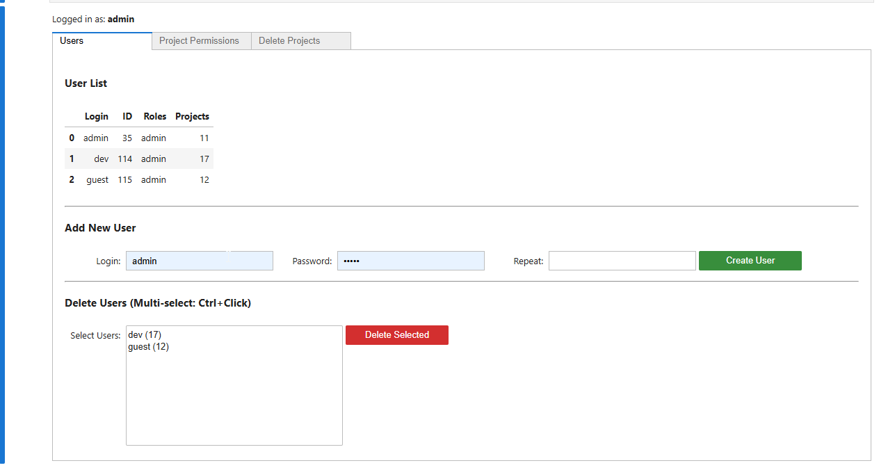 Самым простым способом администрирования является скрипт AdminDashboard.ipunb в который содержит весь основной функционал по добавлению и удалению пользователей, назначению проектов или удаление пользователей с проекта.