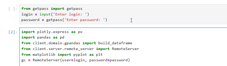 Чтобы скрыть учетные данные в Jupyter Notebook, добавить в первую ячейку запрос логина и пароля. Класс getpass позволяет вводить пароль скрытым способом без возможности его извлечения из переменой. Эти данные сохранятся для всех ячеек до перезапуска ядра блокнота.