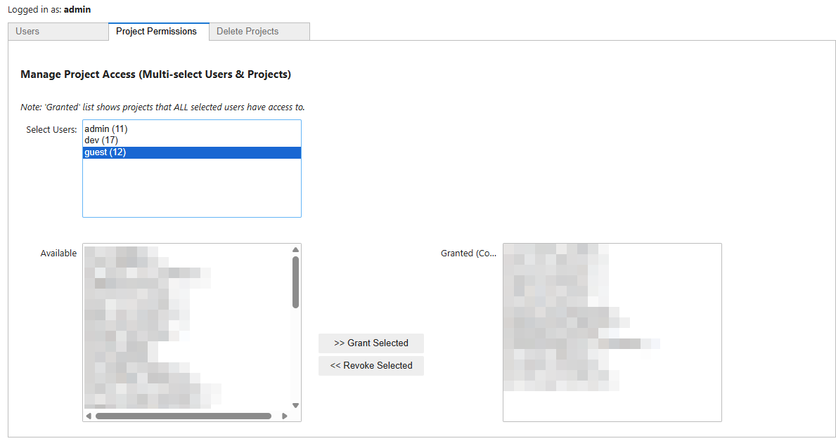 - Управление доступом: * Available (Доступные): Список проектов, к которым у выбранных пользователей нет доступа. * Granted (Предоставленные): Список проектов, к которым у всех выбранных пользователей есть доступ.