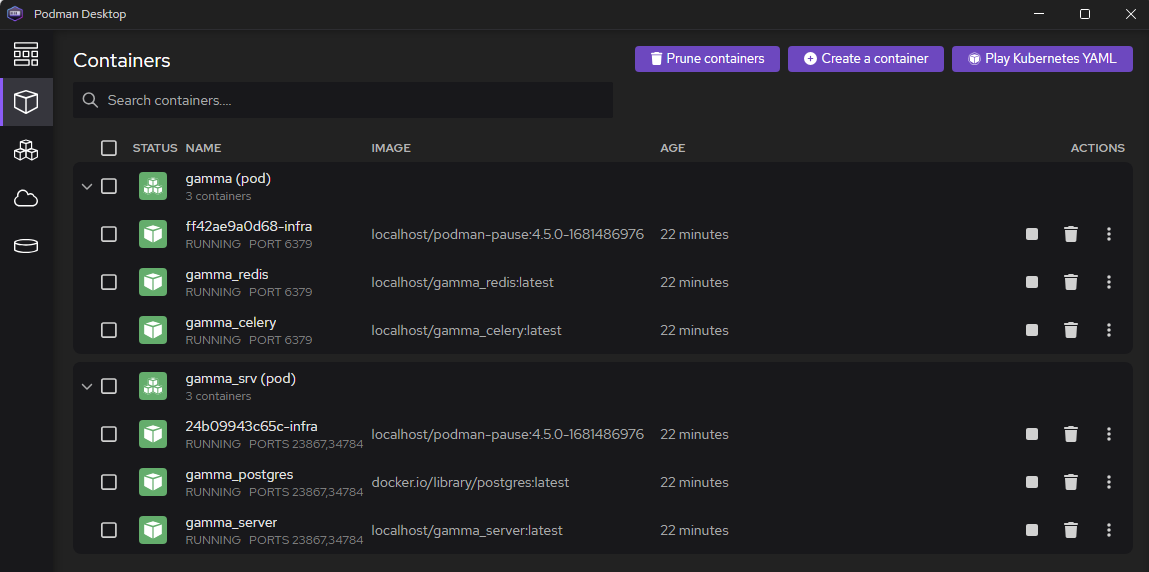 В результате, в Podman должна появиться группа контейнеров “gamma” и gamma_srv. Все 6 контейнеров должны работать постоянно: